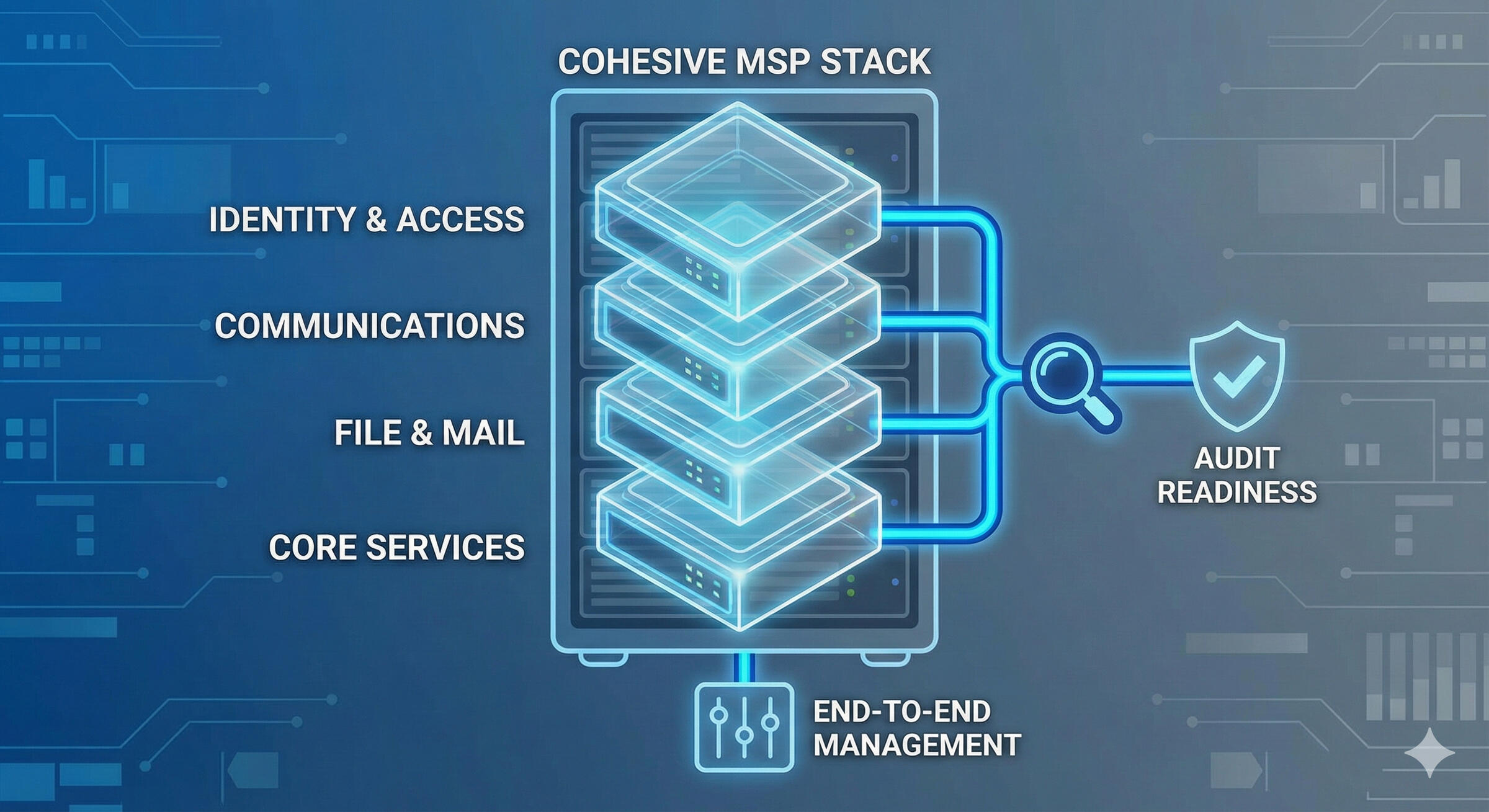Identity, communications, file/mail, and core services unified into a single stack—managed end-to-end for consistency, control, and audit readiness.